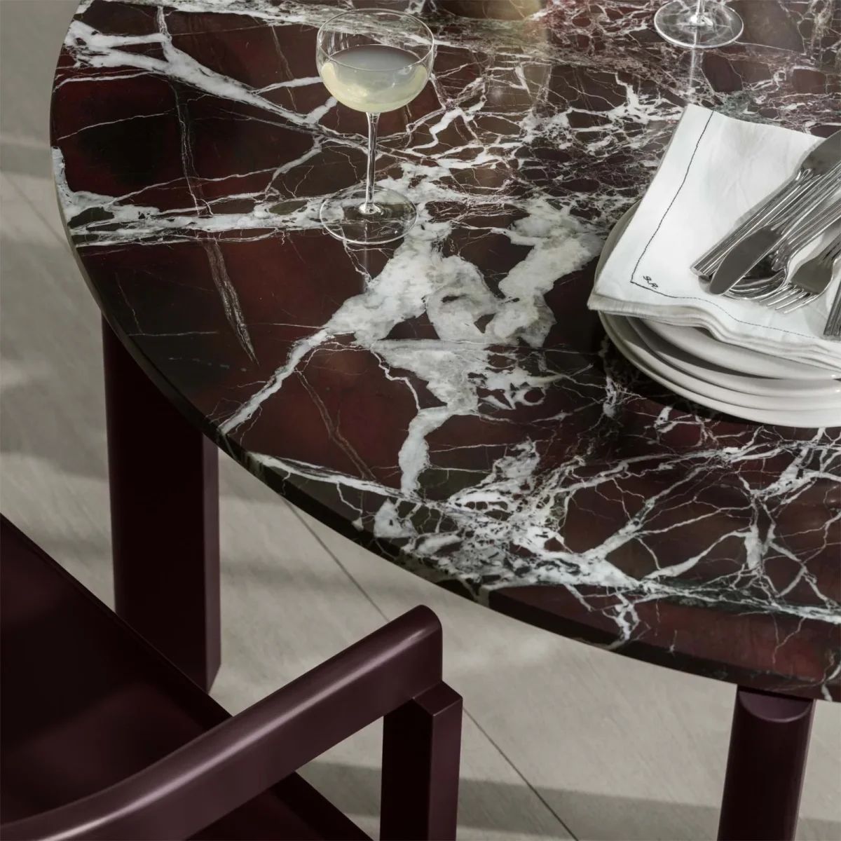 After-stolen förenar konstnärlig närvaro med en påtaglig känsla av komfort. Inspirerad av danska och historiska stolarketyper har Anastassiades skapat en version som känns både bekant och ny. Den breda sitsen och det distinkta ryggstödet i laminerad massiv ask ger stolen ett självsäkert men återhållsamt uttryck. Den finns i klarlackerad ask eller i en djupt vinröd ton och kan kompletteras med en dyna i canvas, naturfärgat eller burgundy-läder. Oavsett placering – ensam eller i grupp – tillför stolen rummet en stillsam karaktär med stark närvaro.