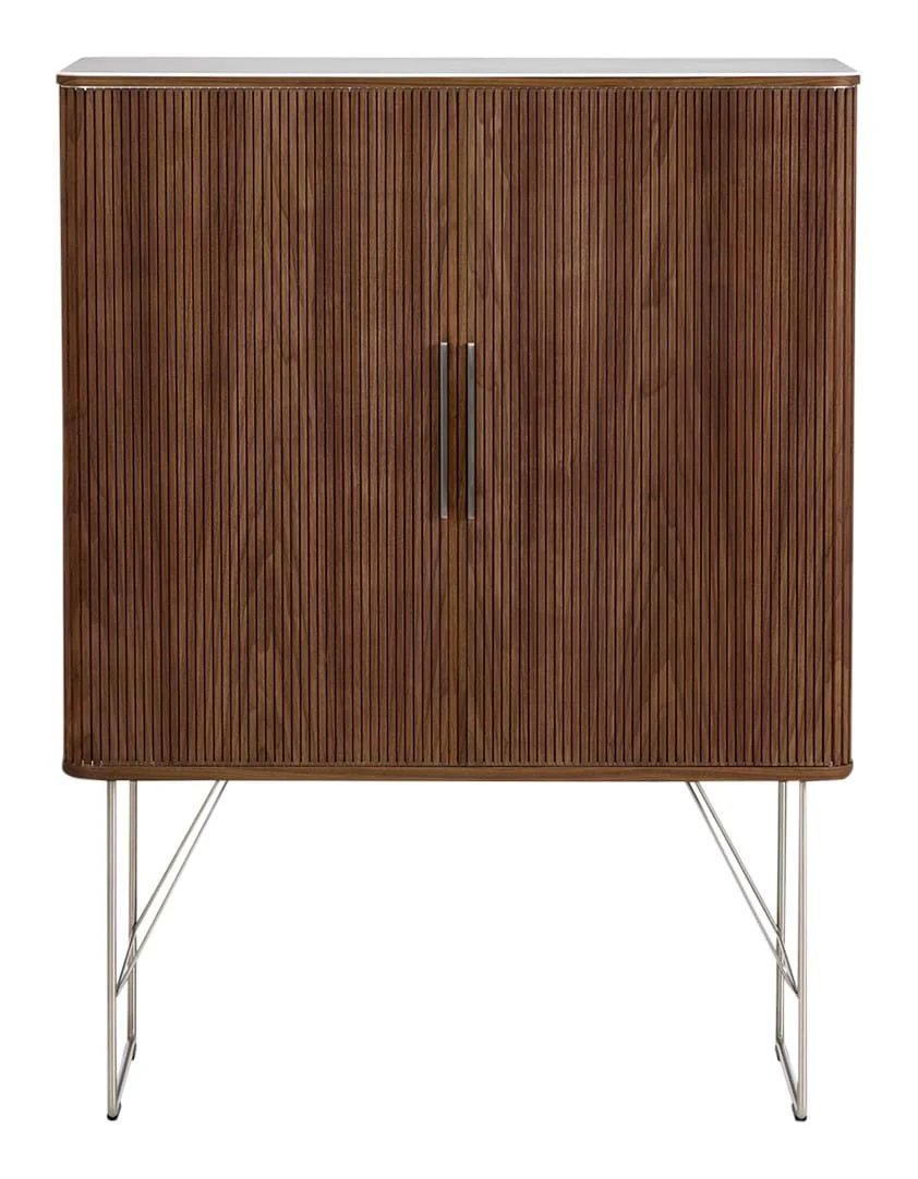 AK 2740 är ett tidlöst skåp formgiven av designduon Nissen & Gehl för Naver. Valet att kombinera massivt trä med det nätta underredet i rostfritt stål skapar ett elegant uttryck som bara framhävs av den vackra toppskivan i komposit materialet Dupont Corian som påminner om elfenben. Skåpets insida har två smidiga lådor i massivt trä och två glashyllplan som omfamnas av två vackra jalusidörrar.