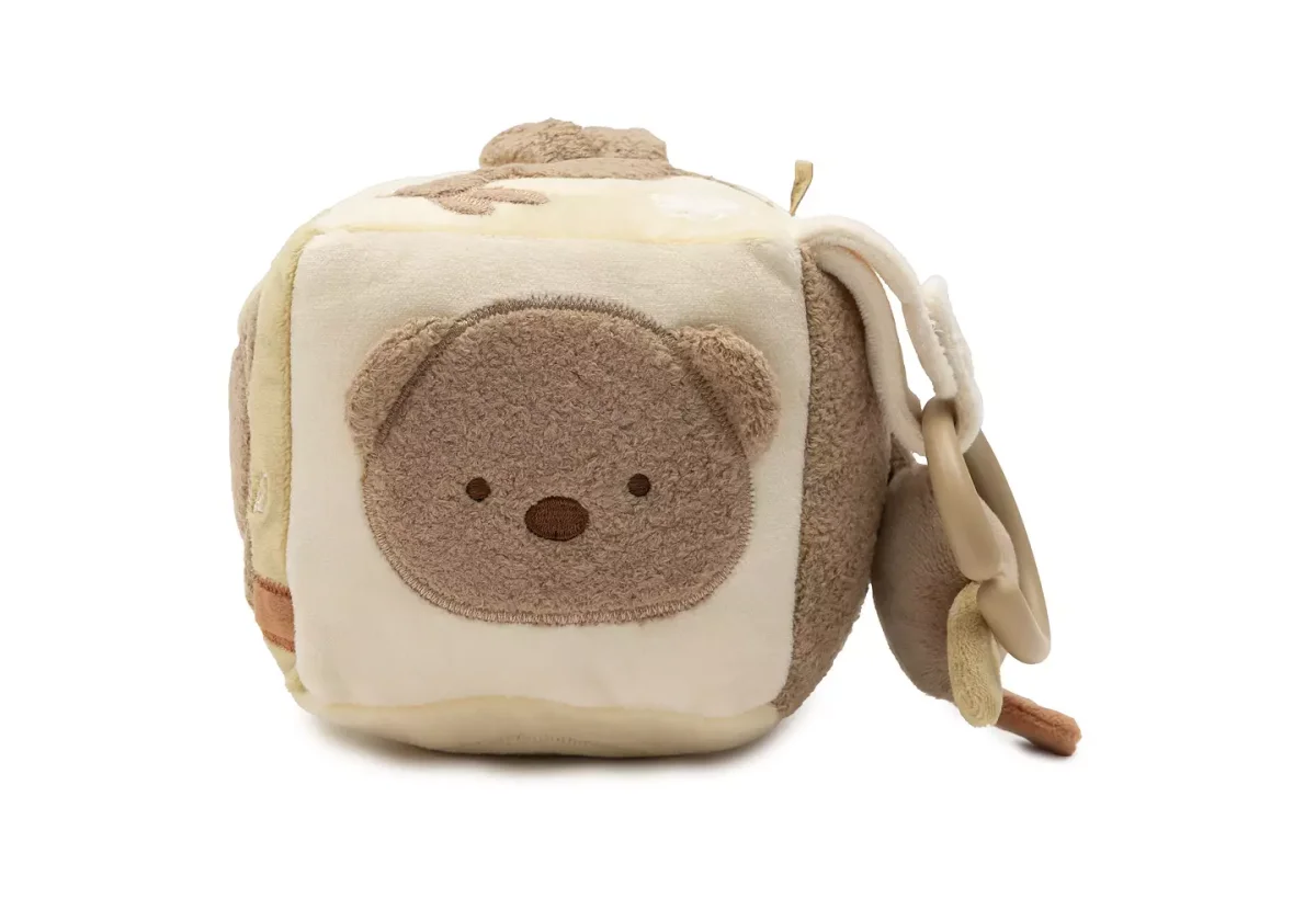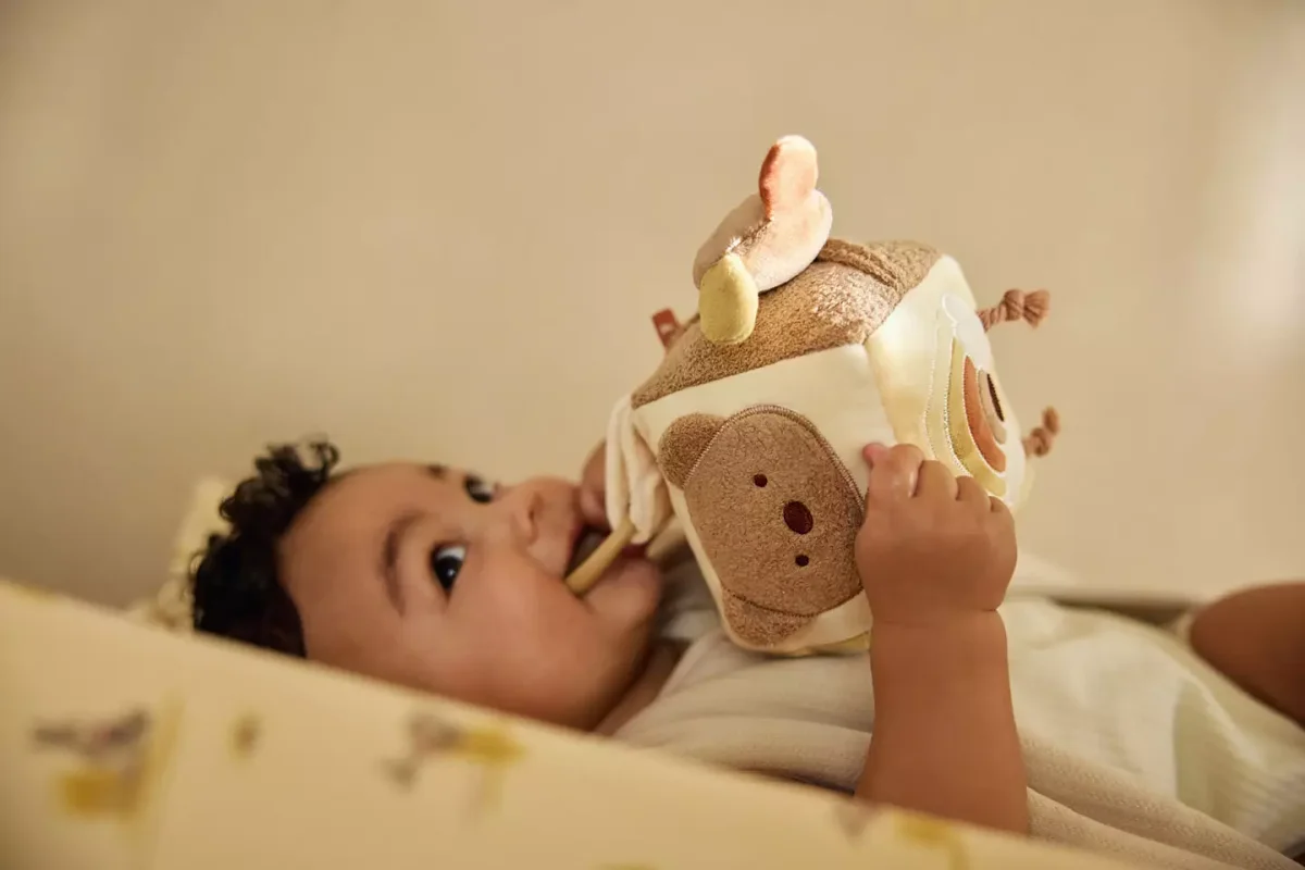 Med olika djurfigurer och roliga interaktiva inslag som skallror, speglar och prassliga tyger stimulerar kuben barnets sinnen och motoriska utveckling.