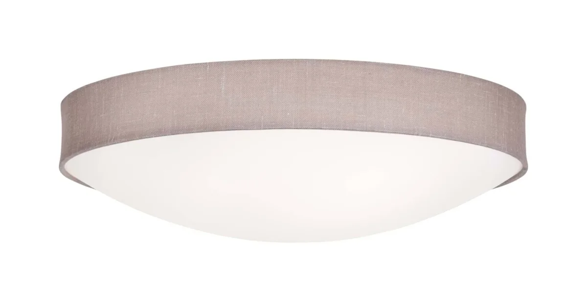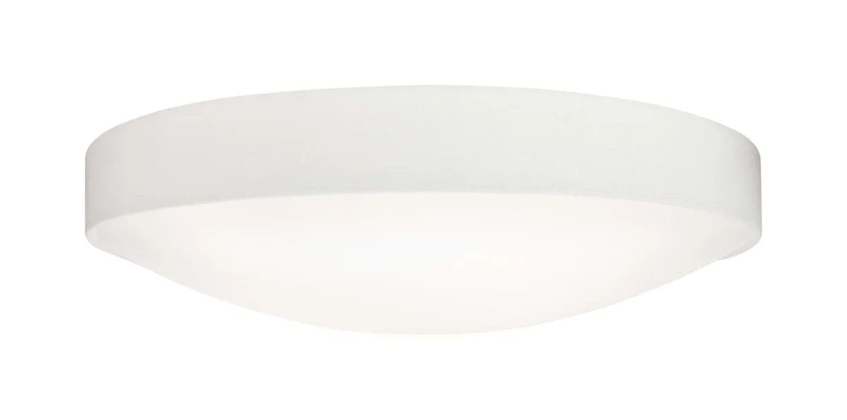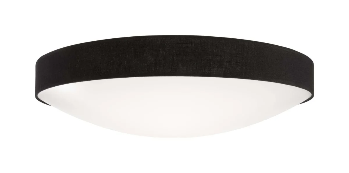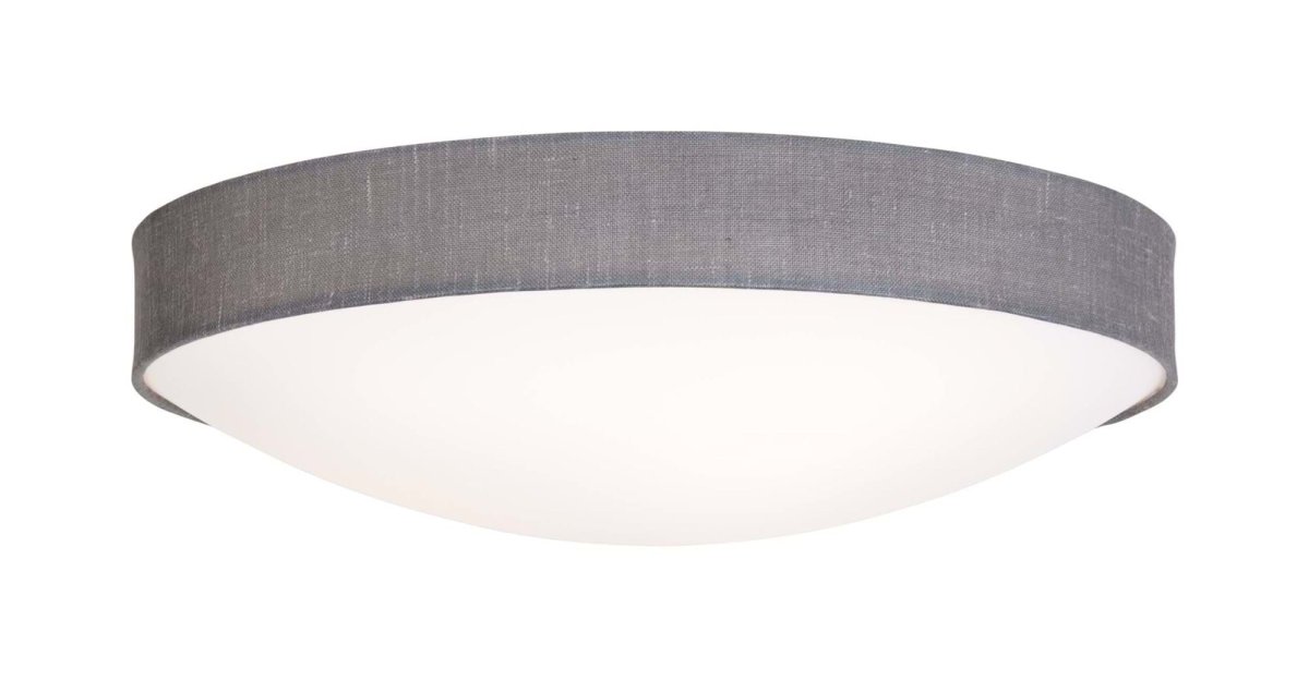 Plaf plafond från Konsthantverk med en lite varmare känsla. Kant har en yttre ring av textil som ger en lite mjukare framtoning. Plafonden fungerar bra tillsammans med LED-lampor.