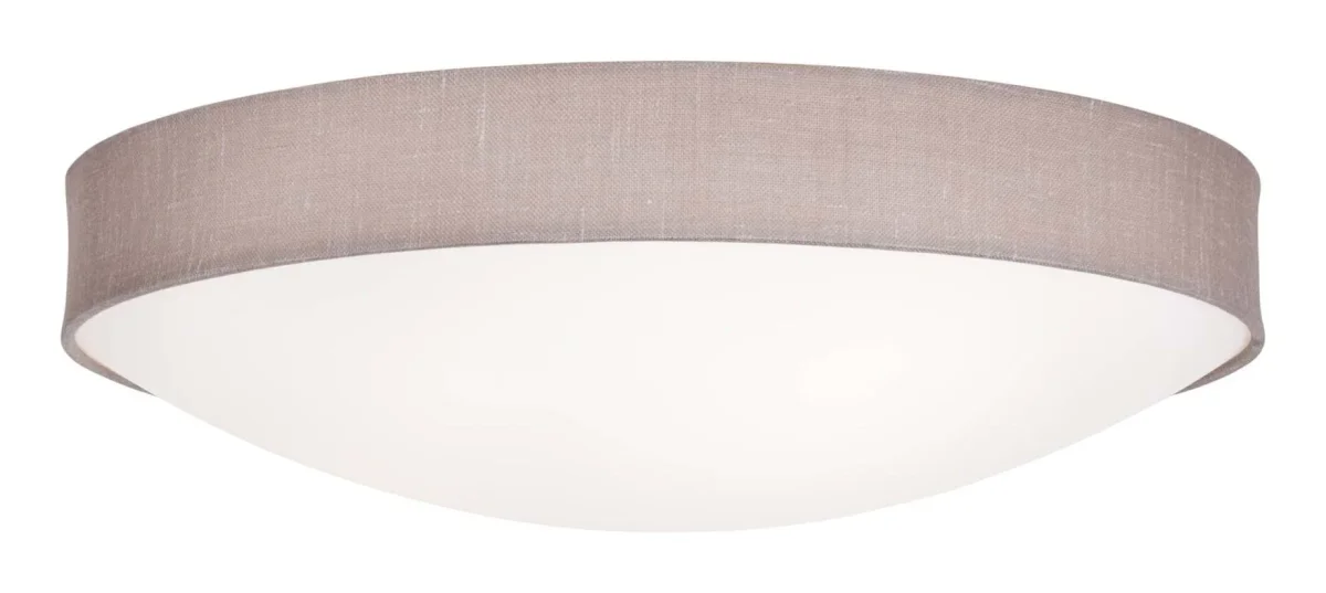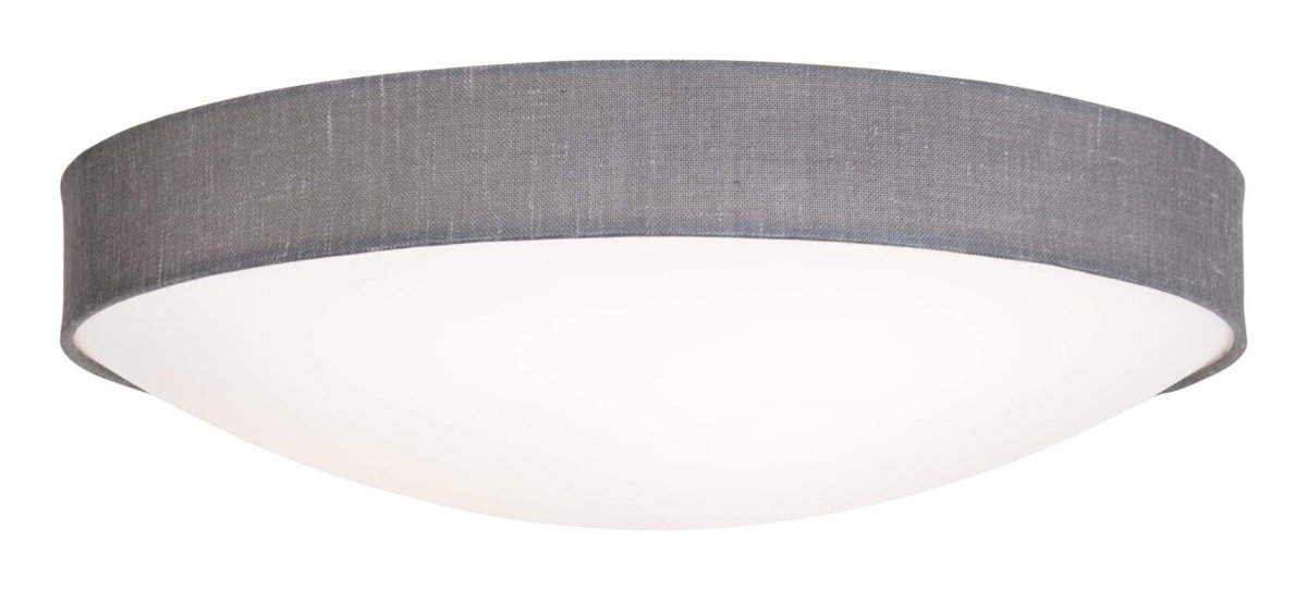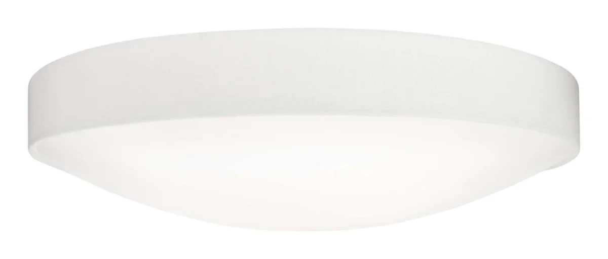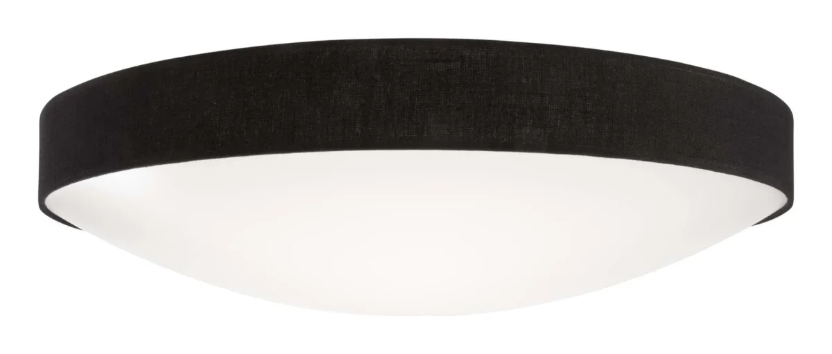 Plaf plafond från Konsthantverk med en lite varmare känsla. Kant har en yttre ring av textil som ger en lite mjukare framtoning. Plafonden fungerar bra tillsammans med LED-lampor.