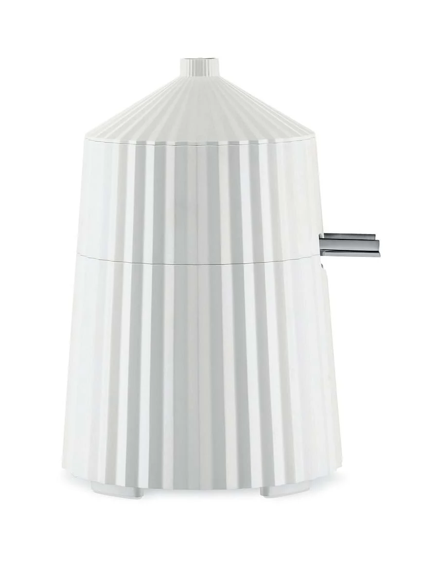 Plisse Elektrisk Citruspress är formgiven av Michele De Lucci för Alessi. Citruspressen har en automatisk start och stopfunktion. Placera fruktens halva på juicetoppen och aktivera juicepressen med ett lätt tryck. Mekanismen stängs av när trycket upphör. För att förhindra att det droppar juice när du byter glas kan du enkelt vika upp den silvriga pipen. Kabeln göms snyggt under i botten och du drar själv ut den längd som behövs för att koppla in i ditt vägguttag.