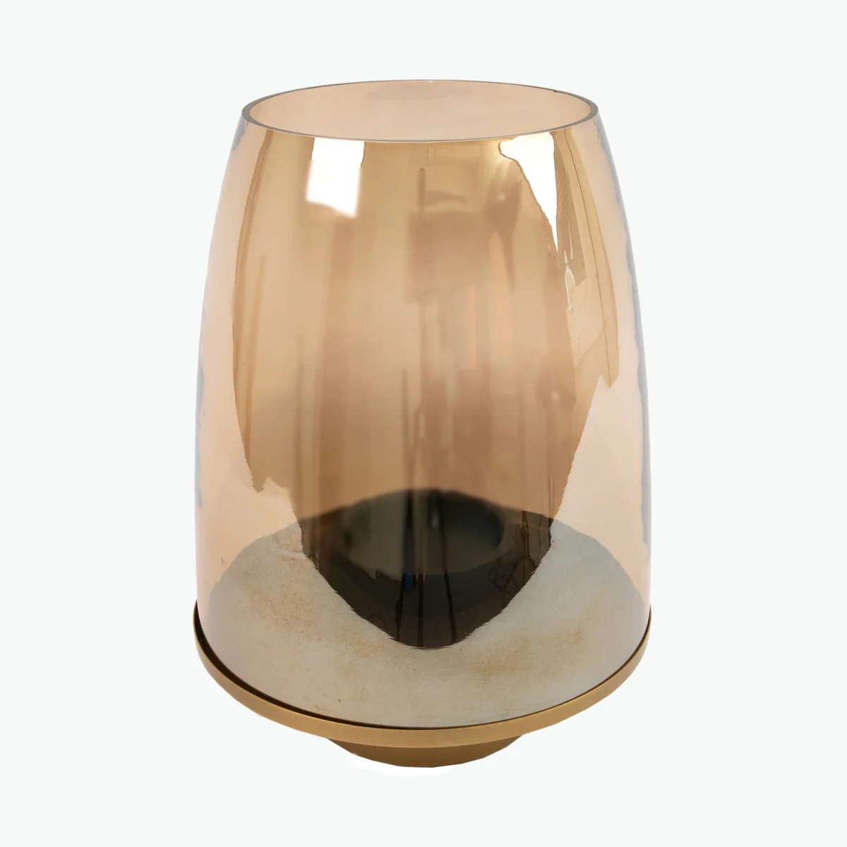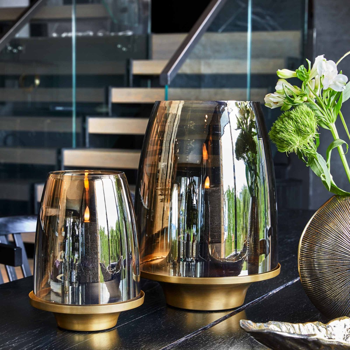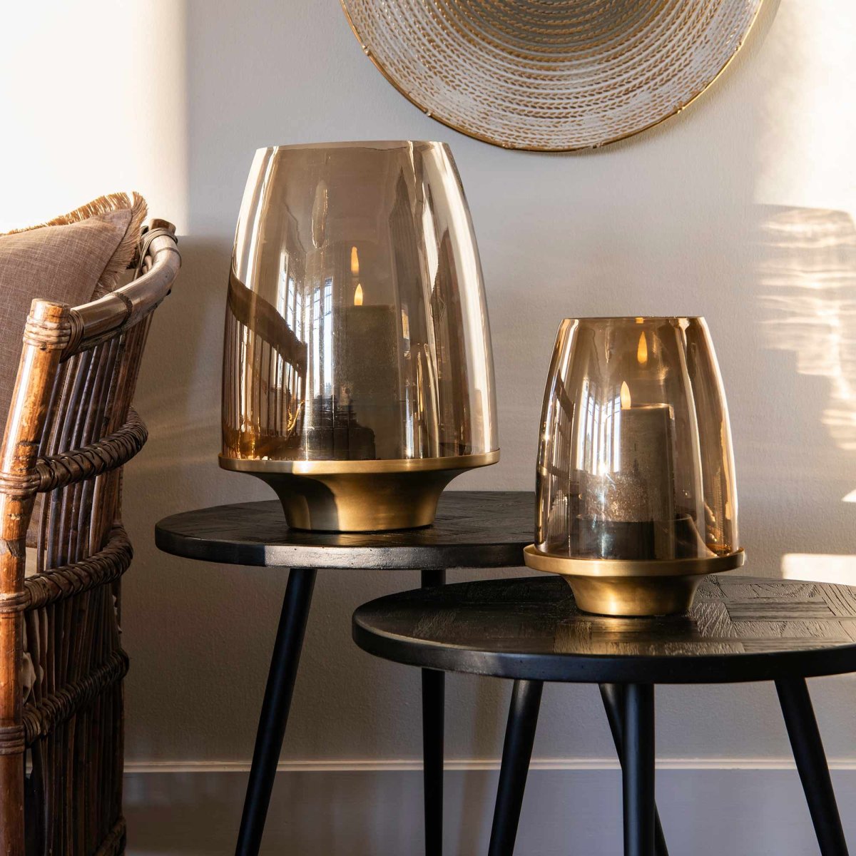 Ståtlig lykta med munblåst glas med en gyllen lystereffekt. Denna lykta är vacker för sig själv, men helt fantastisk tillsammans med den lilla Ravina-lyktan. Använd gärna Glow ljusslinga eller ett av våra Candela LED-ljus i denna lykta.