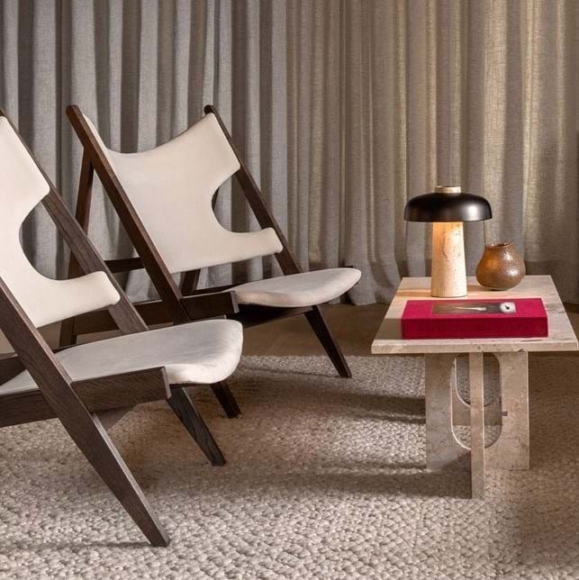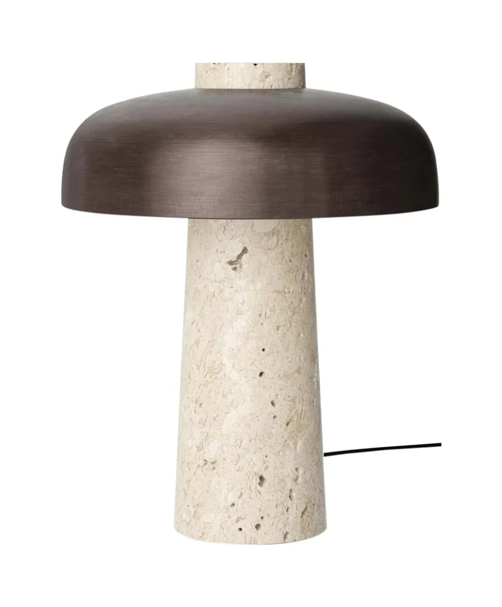 Reverse Table Lamp är en bordslampa formgiven av Aleksander Lazic för danska Audo Copenhagen. Den robusta lampfoten är tillverkad i travertine, som har naturliga ådringar och textur som ger en levande känsla. Lampskärmen är gjord av aluminium med anodiserad färg och har en inbyggd LED-belysning som fördelar ljuset jämnt över den råa stenen och ger ett vackert sken. På toppen av lampan sitter en dimmer där man enkelt kan styra från svagt till varmt ljus. Oavsett om lampan är på eller inte är den ett vackert skulpturalt föremål.