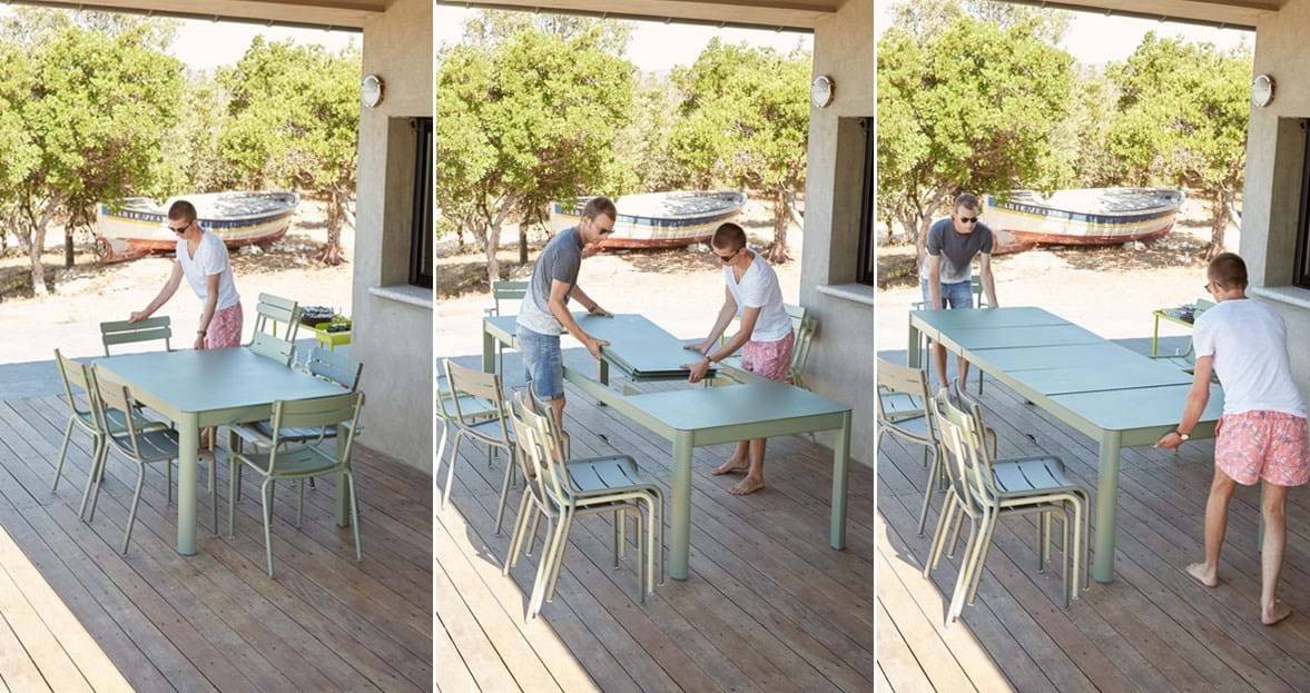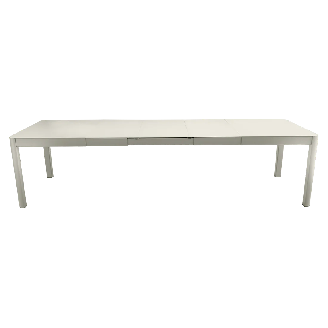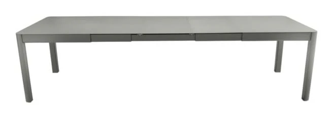 Ribambelle är en serie praktiska och stilrena utdragbara bord från franska Fermob. Borden tillverkas med ett aluminium underrede och bordskiva som är vädertåligt och robust, samtidigt som bordet är förvånansvärt lätt. Borden har en smart magasinfunktion som dolt kan förvara iläggsskivorna medans de inte används. Och med hjälp av bordets teleskopgångjärn i kombination med bordets lätta vikt så är det lätt att plocka upp och ner iläggsskivorna. Ribambelle är ett perfekt matbord för uteplatsen eller trädgården som också passar för större tillställningar. Välj mellan Fermobs breda urval av färger för att hitta din favorit.