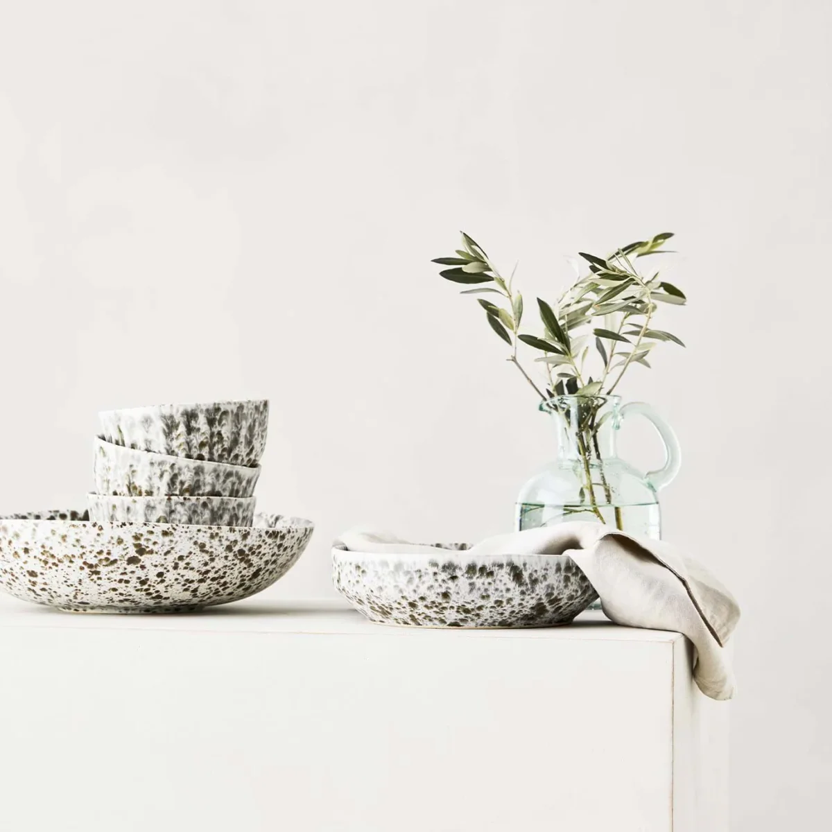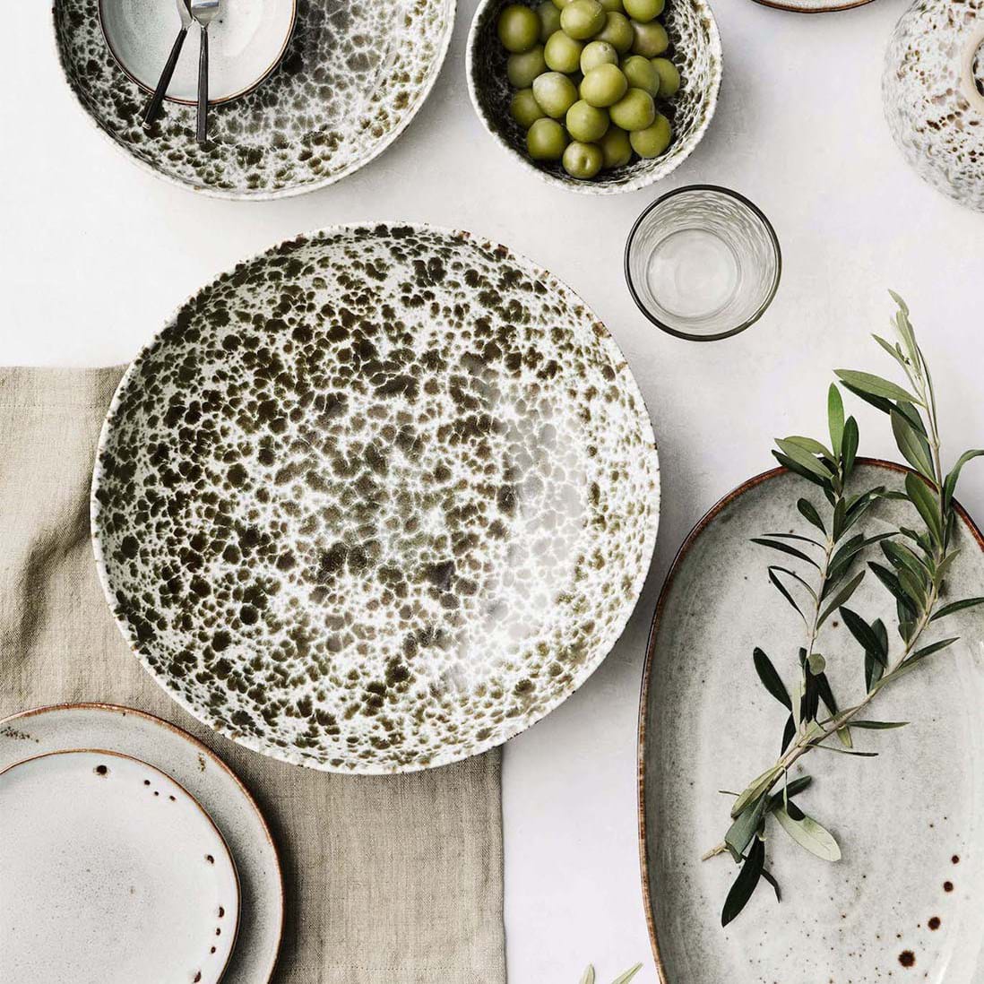 En vacker serveringsskål med stänkmönster i glaserat stengods och en semi-matt finish. Vår Rivoli salladsskål har ett unikt grönt mönster på en vit botten. Den handgjorda skålen är både elegant och mångsidig, vilket gör den perfekt för alla tillfällen. Genom att duka med serien Rivoli skapar du enkelt en inbjudande och vacker dukning. Alla skålar är handgjorda, vilket gör att varje produkt är unik när det gäller färg, form och känsla. Färger och mönster kan därför variera från skål till skål, men de kommer att ge din dukning liv och personlig prägel.