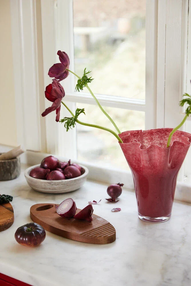 Som en nyutsprungen blomma vecklar den ut sina blad. Vas viva flörtar med oss på ett förföriskt sätt – de organiska formerna och den diskreta pondusen. Viva vas stoltserar som en statyett med och utan gröna blad och blomster. Viva vas stor i bordeaux färgat glas pryder vilket vackert bord som helst och skapar mysig stämning direkt. Ett svenskt original som har en självklar plats i alla hem. Alla vaser är handgjorda och unika. Levereras i klassisk presentbox. Design Studio Sagaform.
