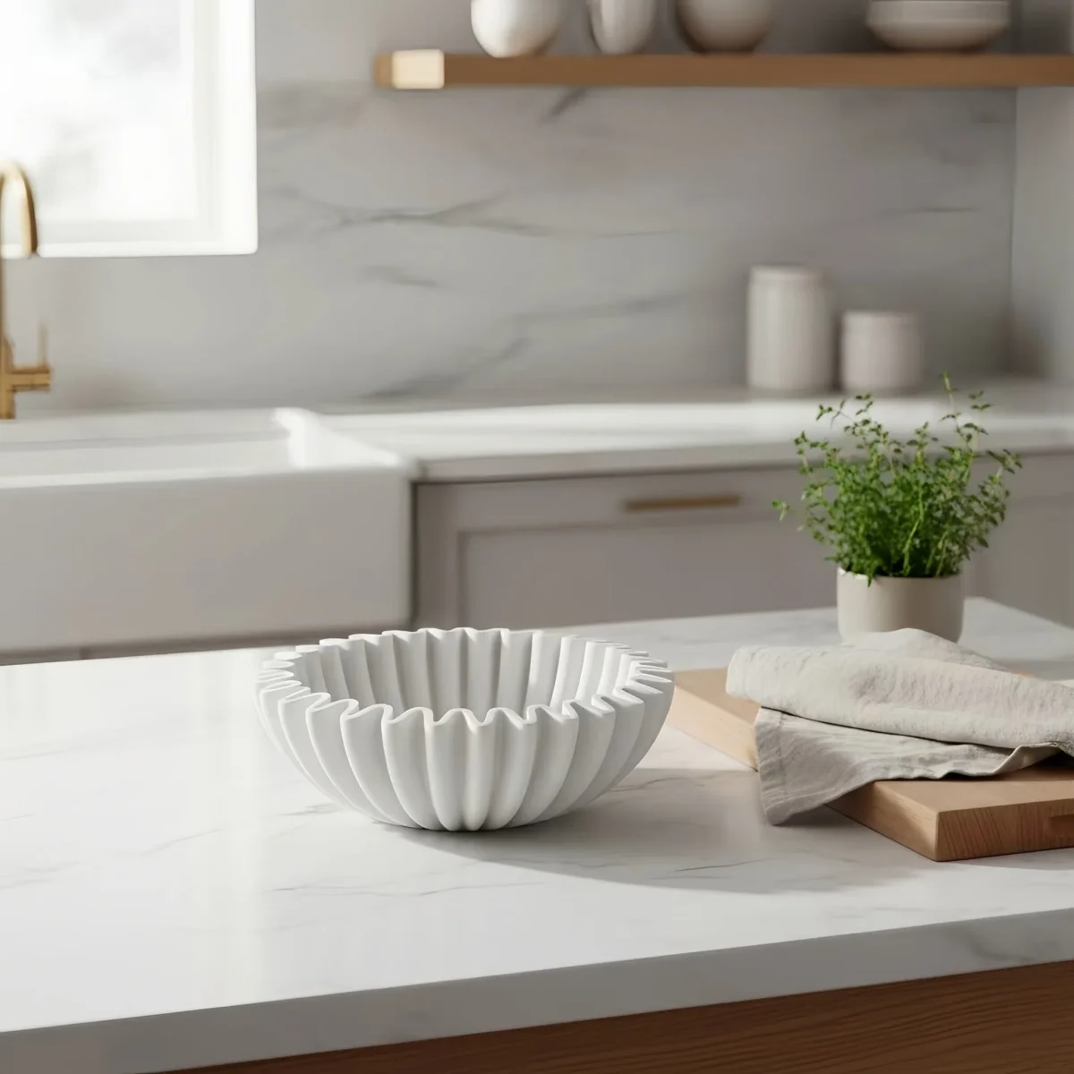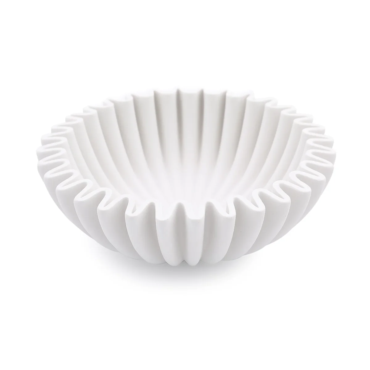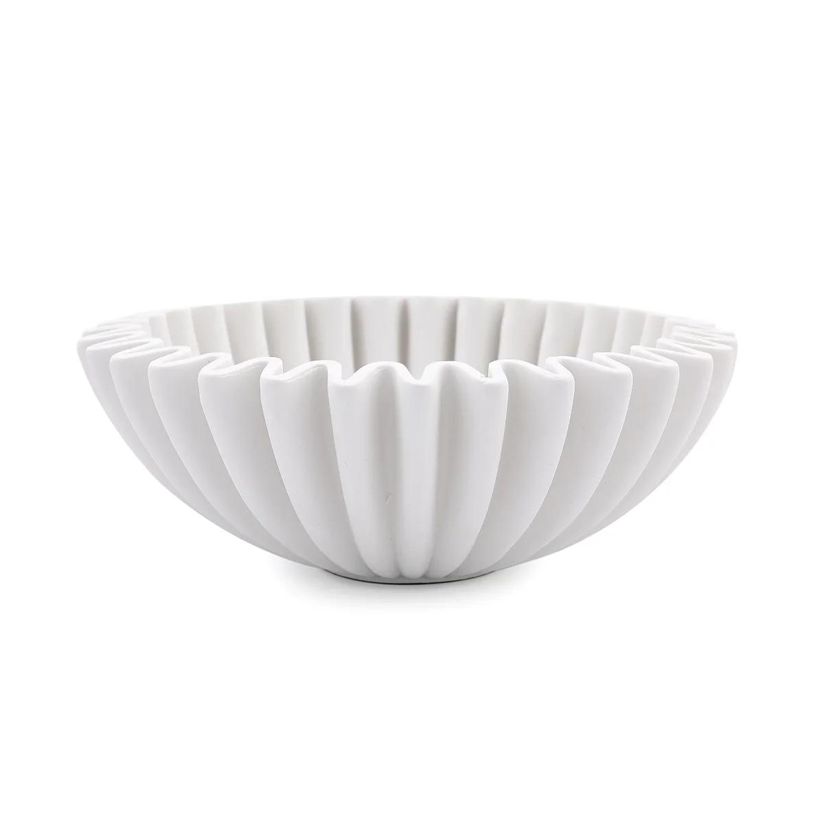 Denne dekorative dekorskålen i polyresin kombinerer stil og funksjon med sitt rillede mønster og myke, matte finish. Det tidløse designet gjør den til en vakker detalj i hjemmet. Perfekt som blikkfang på et bord, i en hylle eller i en vinduskarm.