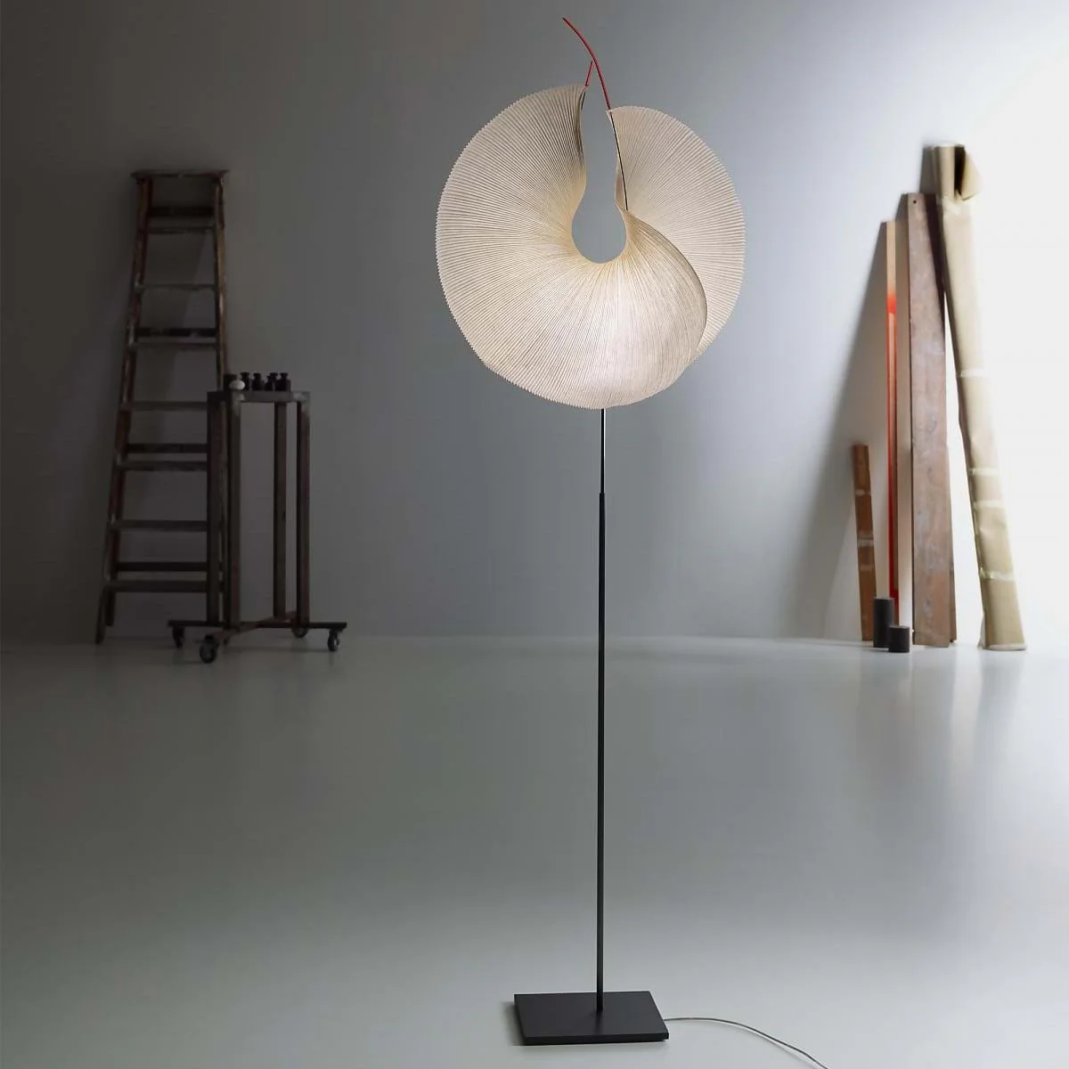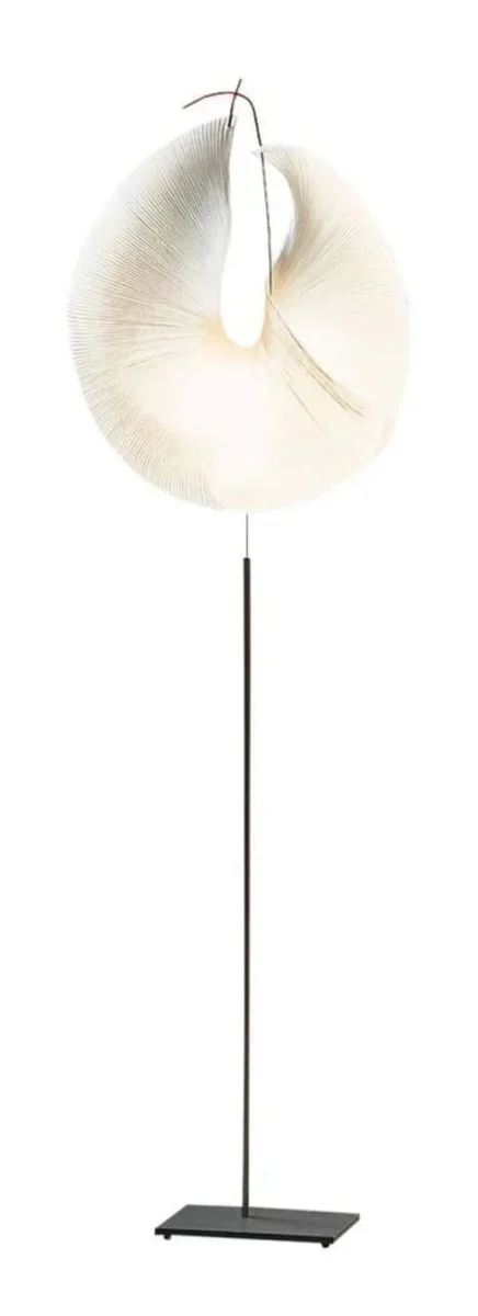 Yoruba Rose Floor är golvlampan i serien Yoruba Rose, ursprungligen känd som en bordslampa. Den nästan cirkelrunda pappersskärmen är upphängd i tunna metallstänger och hålls uppe av en smal stång i rostfritt stål. Höjden kan justeras mellan 130 och 160 cm.
