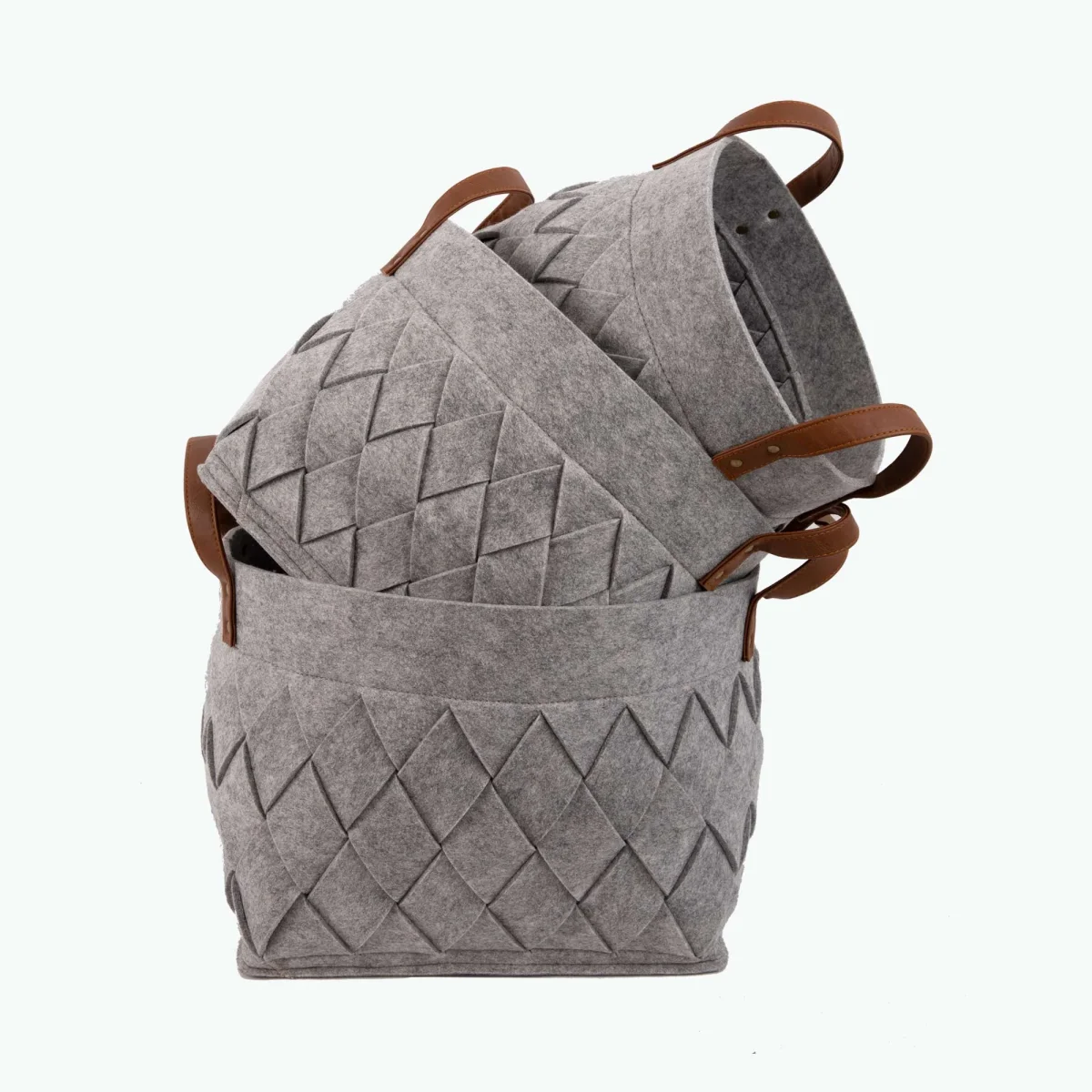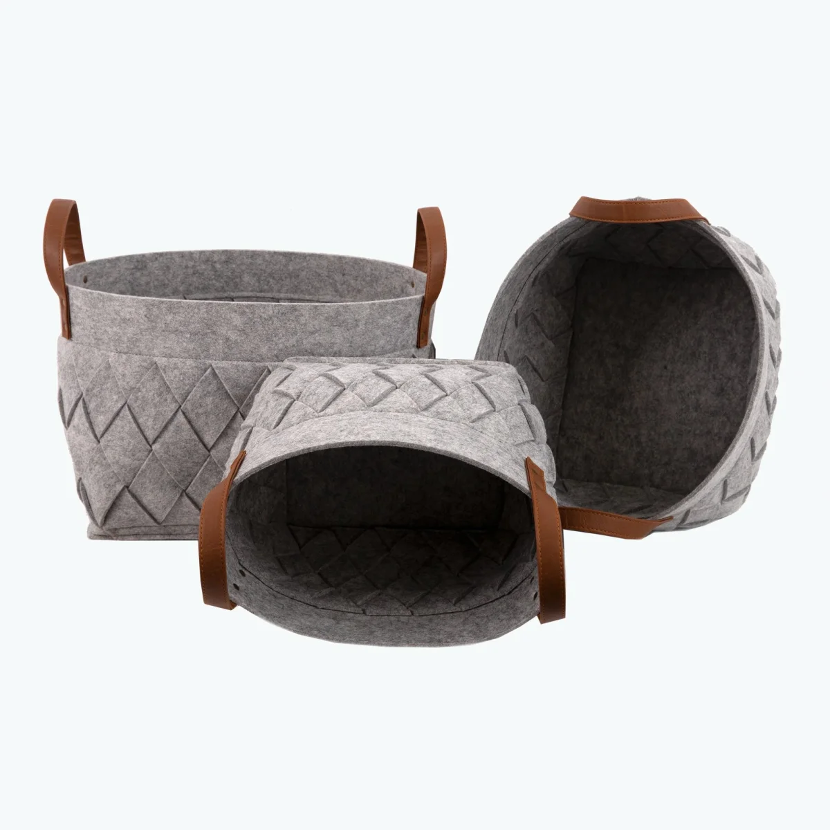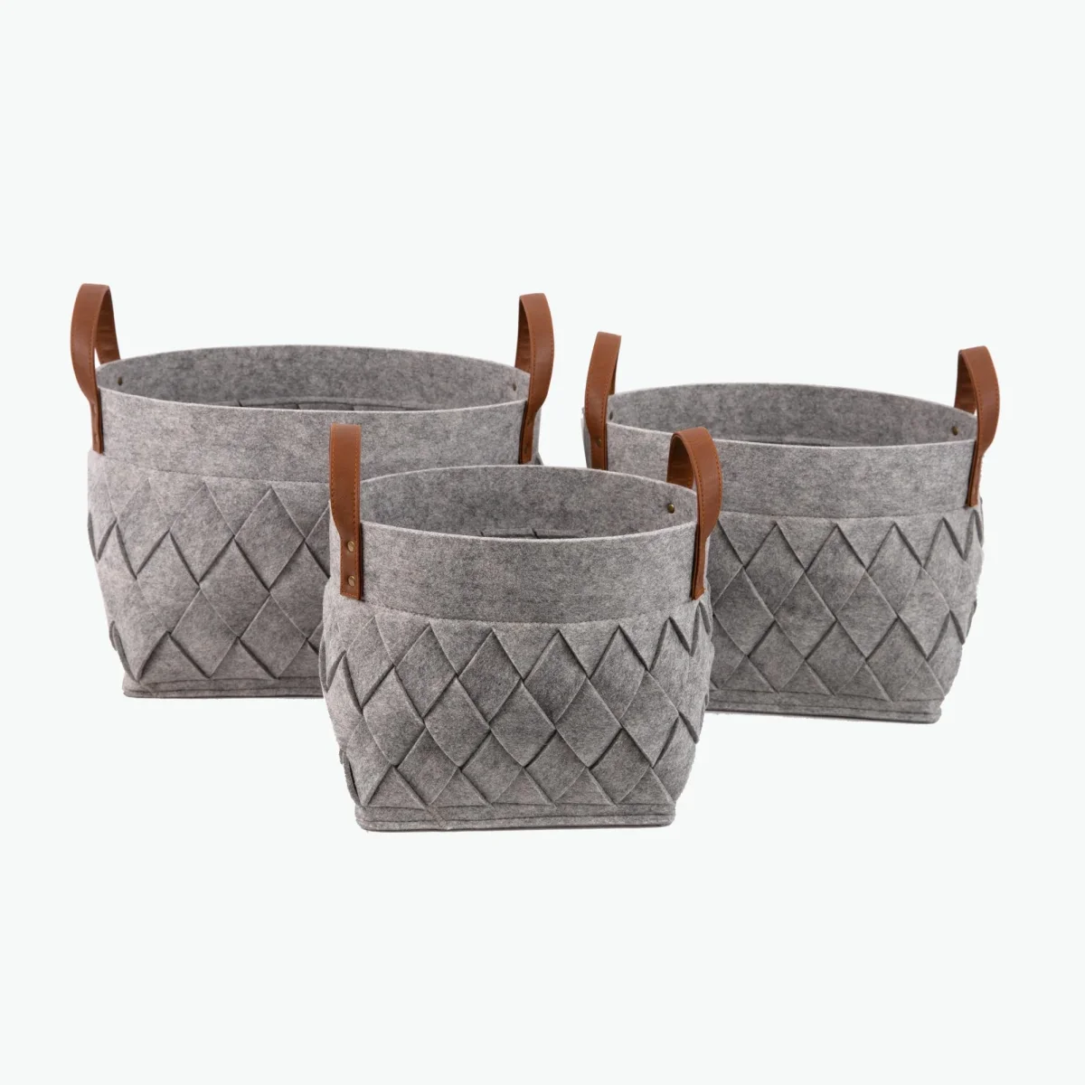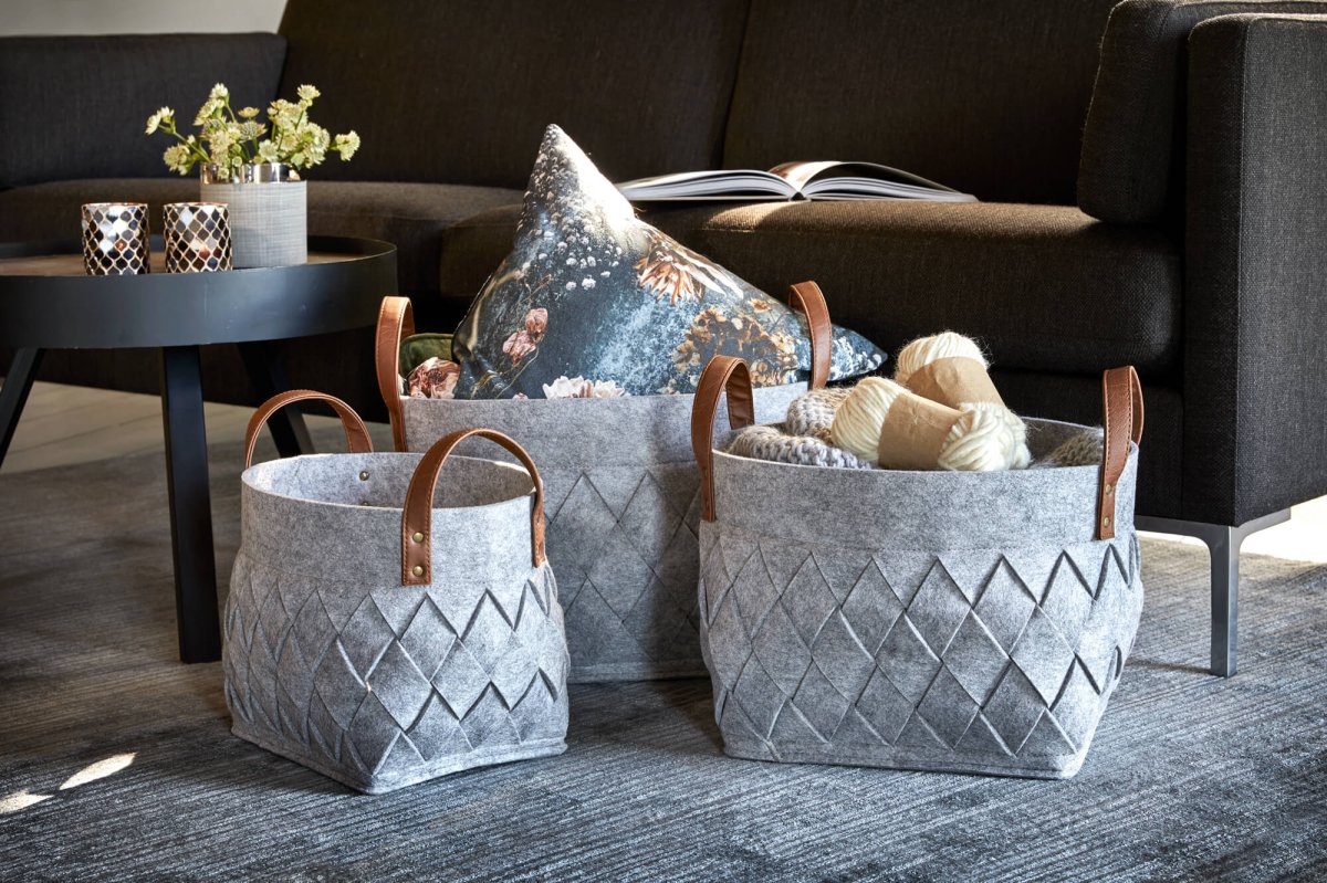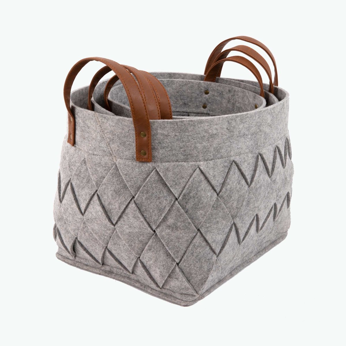 Praktiska och fina förvaringskorgar i ljusgrå filt med snyggt flätat mönster. Setet består av 3 korgar med handtag i brunt konstläder. Passar i husets alla rum. Stor: 36x28x30 cm Medium: 31x25x28 cm Liten: 26x20x26 cm